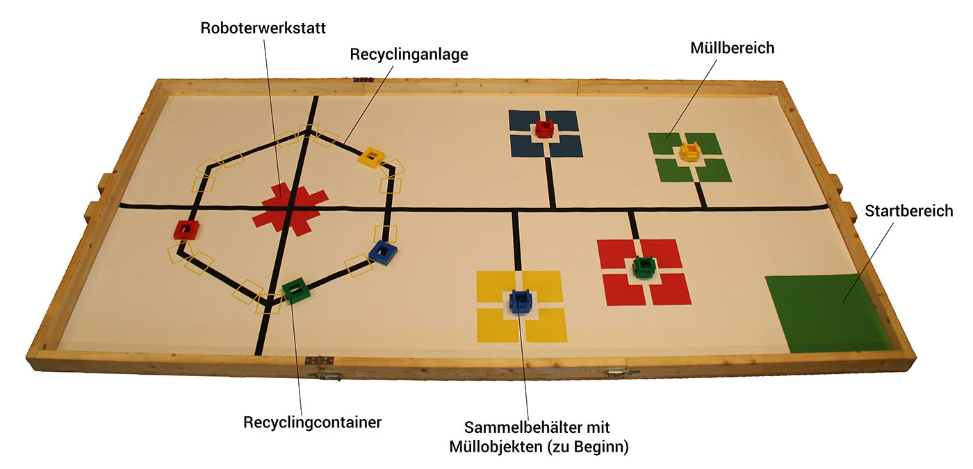 Bei der Aufgabe der Altersklasse Senior baut und programmiert ihr einen Roboter, der den Müll in die Recyclinganlage bringt und in die entsprechenden Recyclingcontainer einsortiert. Außerdem sollen die ursprünglichen Sammelbehälter für den erneuten Einsatz vorbereitet werden.