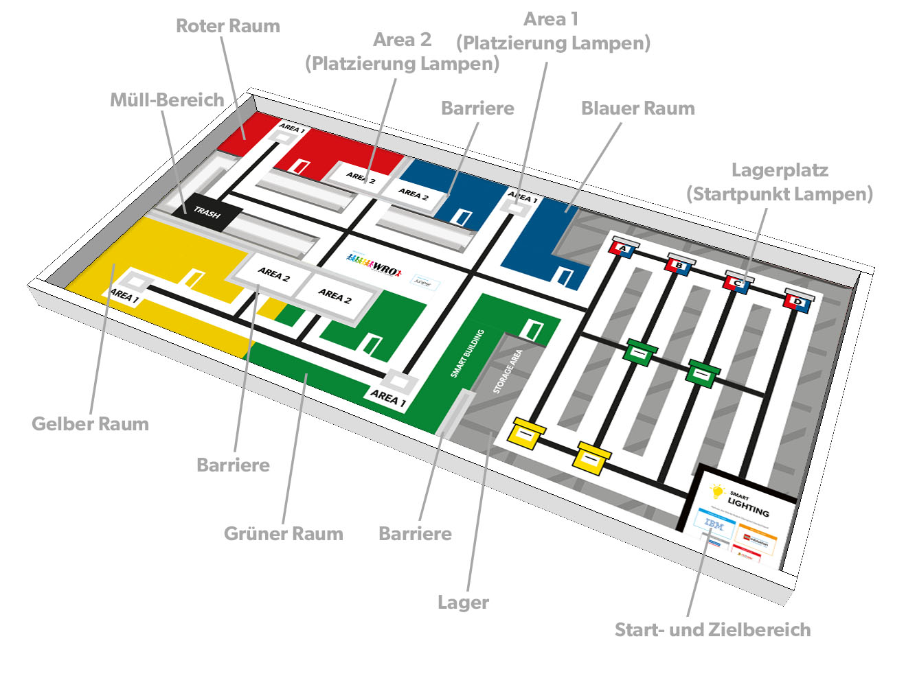 In der Altersklasse Junior baut ihr einen Roboter, der alte Lampen durch smarte (intelligente) Lampen ersetzen soll. Die alten Lampen müssen korrekt entsorgt werden, während die neuen Lampen an den jeweils richtigen Einsatzort gebracht werden müssen.