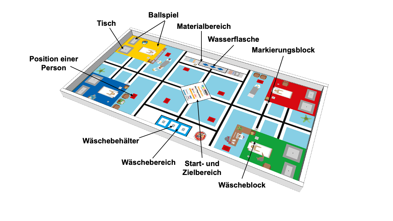 Auf dem Spielfeld der Altersklasse Senior übernimmt euer Roboter die Rolle eines Serviceroboters für Pflege und Transport in einem Krankenhaus. Er soll Wäsche in die krankenhauseigene Wäscherei bringen, Wasser in verschiedene Zimmer bringen und mit den Patienten spielen. Gleichzeitig soll euer Roboter auf seinem Weg durch das Krankenhaus auf das Krankenhauspersonal und die Besucher achten.