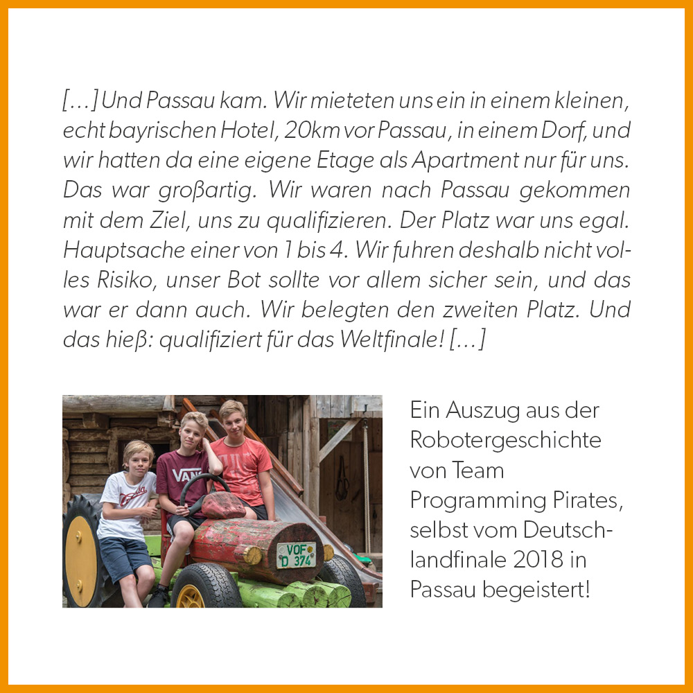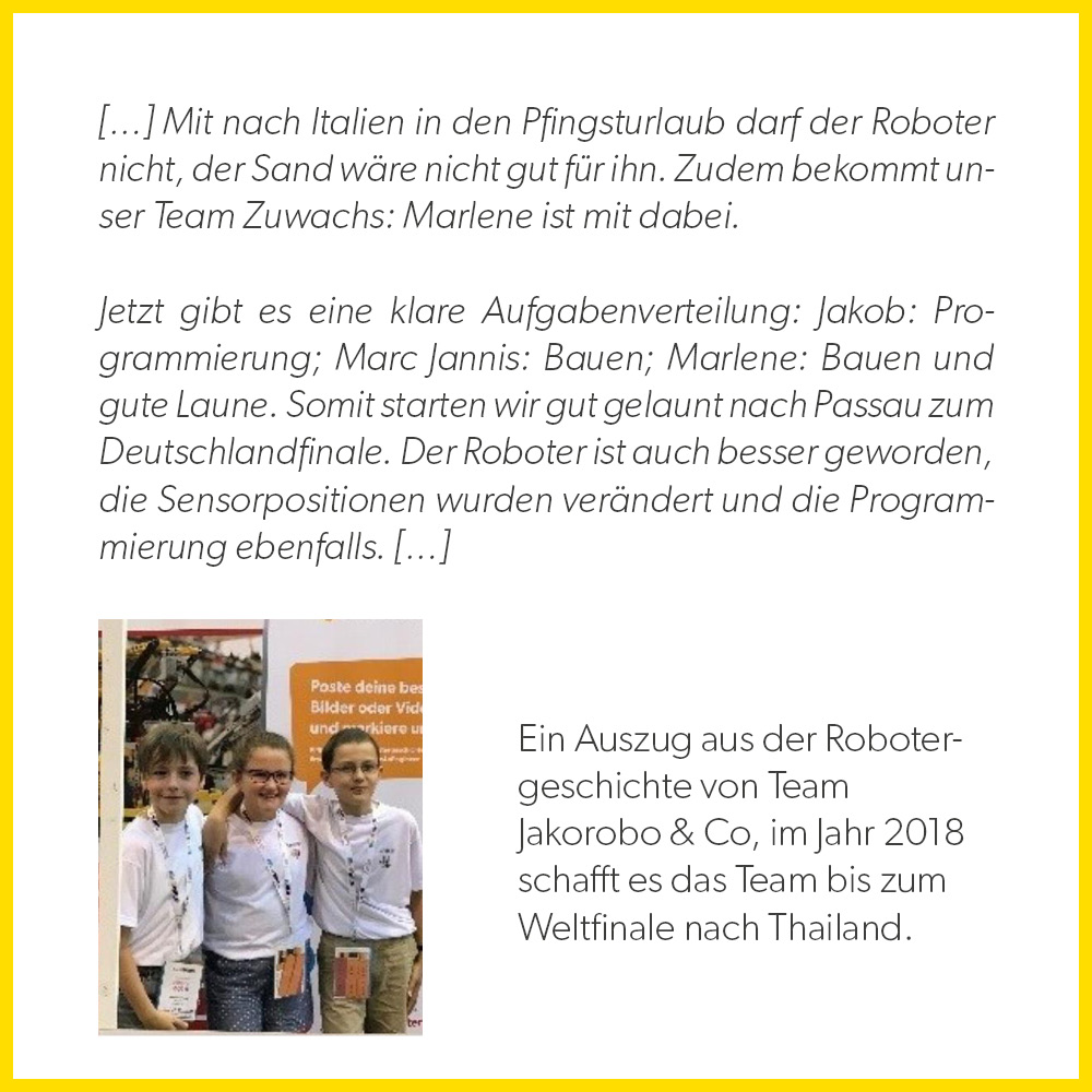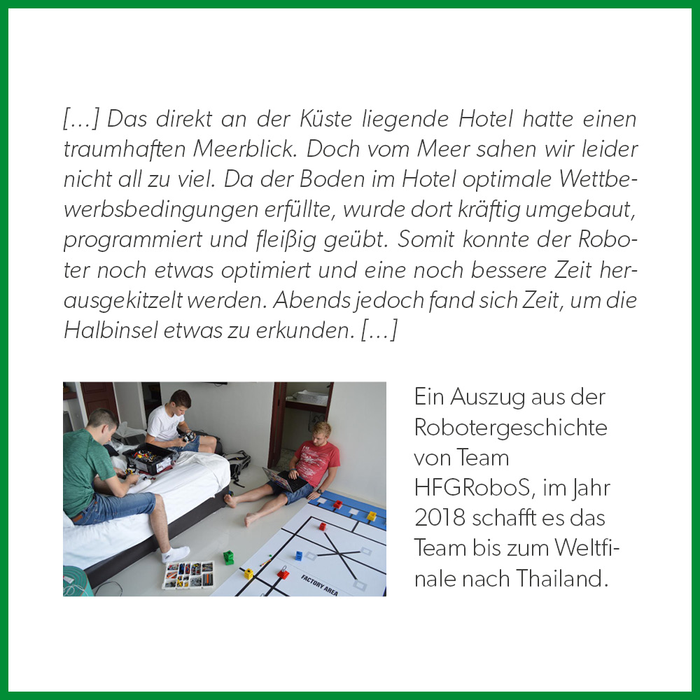 Es sind die Geschichten von Kindern und Jugendlichen, die bei unseren Wettbewerben zum ersten Mal in einem Team antreten und lernen, was es bedeutet, ein Teil einer Gruppe zu sein. Oder von besonders erfolgreichen Teams, die es bis zum Weltfinale schaffen und neben einer internationalen Wettbewerbsteilnahme Eindrücke aus einem anderen Land oder Kultur mitnehmen. Wir möchten noch mehr von diesen Geschichten ermöglichen.