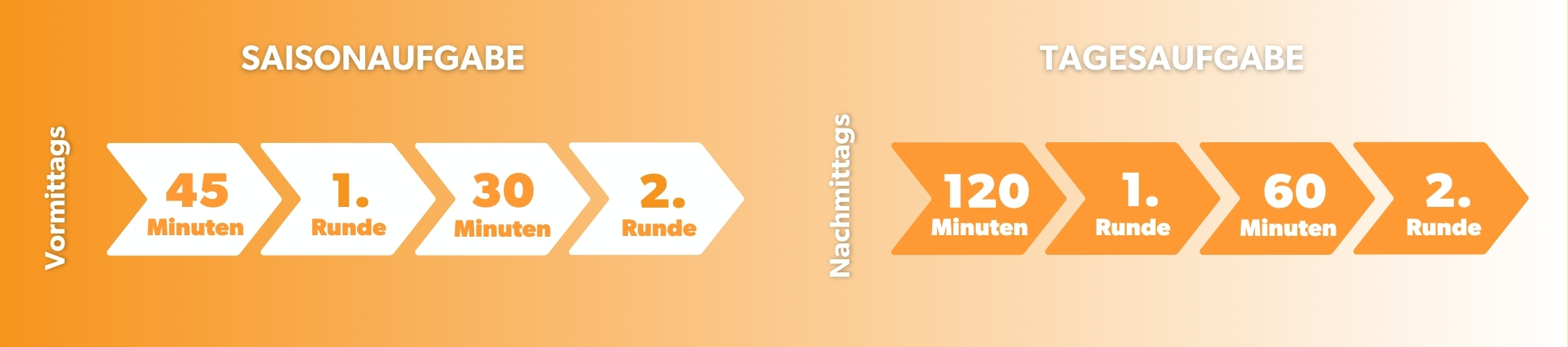 Für jeden Wettbewerbstag gibt es in jeder Altersklasse eine neue Tagesaufgabe. Ihr könnt euch in der Vorbereitung in eurem Team Gedanken über mögliche Aufgaben machen und überlegen, wie ihr diese lösen würdet.