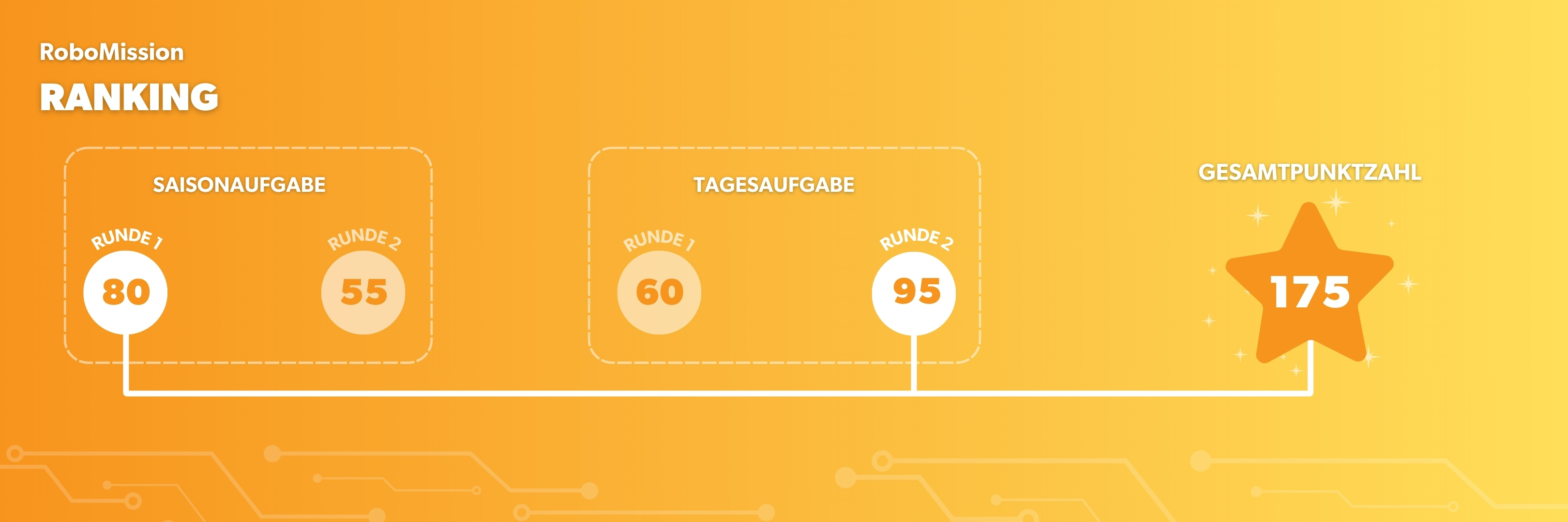 Von den vier durchgeführten Roboterläufen jedes Teams wird der bessere Lauf der Saisonaufgabe und der bessere Lauf der Tagesaufgabe addiert. Dann wird ein Ranking nach der höchsten Punktzahl erstellt. Bei Gleichstand zählen zunächst die Zeiten der addierten Läufe, dann wird der beste Lauf der Tagesaufgabe betrachtet. Anschließend wird der zweitbeste Lauf der Saisonaufgabe gefolgt vom zweitbesten Lauf der Tagesaufgabe herangezogen. In der Regel qualifiziert sich das Gewinnerteam jeder Altersklasse eines regionalen Wettbewerbs für das Deutschlandfinale.